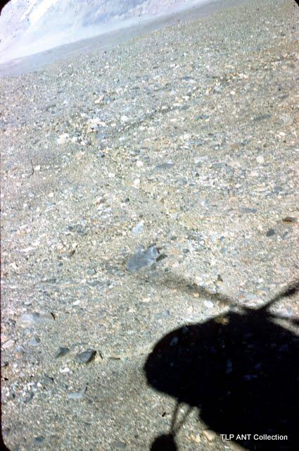 View of terrain near Canada Glacier with shadow of hovering helicopter