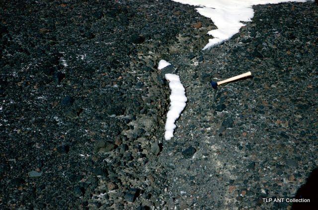Tesselation crack in the basalt fragments on Cape Armitage. Old weathered basalt on each side of the crack but fresh or unweathered basalt being pushed up along side of the crack.