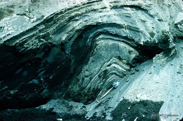 Station 136. Close shot of deformed stratified silt and sand. Probably deformed by ice push. Same as b&w 1652.