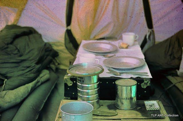 Interior view inside red tent of our trunk made into a table set for dinner. Note red coloring.