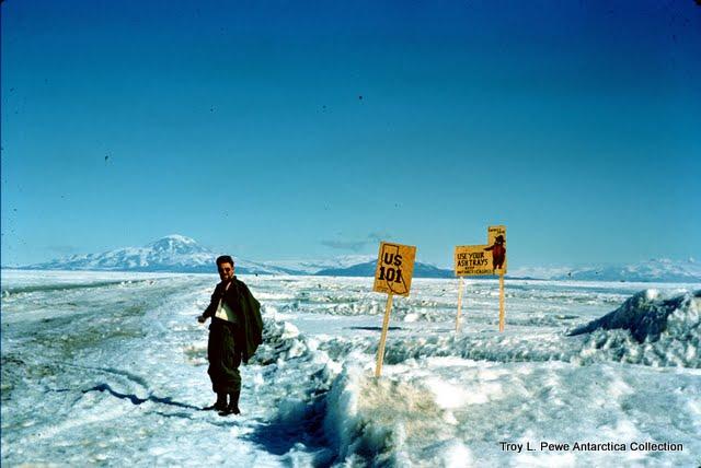 Road cross bay ice to Bay Ice airfield with Gordon Turnbull from England thumbing a ride and U.S. 101 and Keep Antarctica Green signs in the rear.