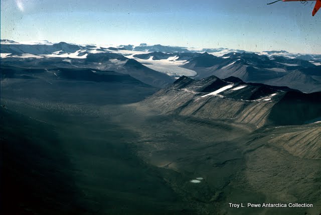 View north up the transverse valley showing the Grand Canyon of the Antarctic and the Dry Valley immediately to the north. In this valley one can see perhaps the Early Wisconsin moraines overriden by valley glaciers coming out of the right of Lake Wisconsin.