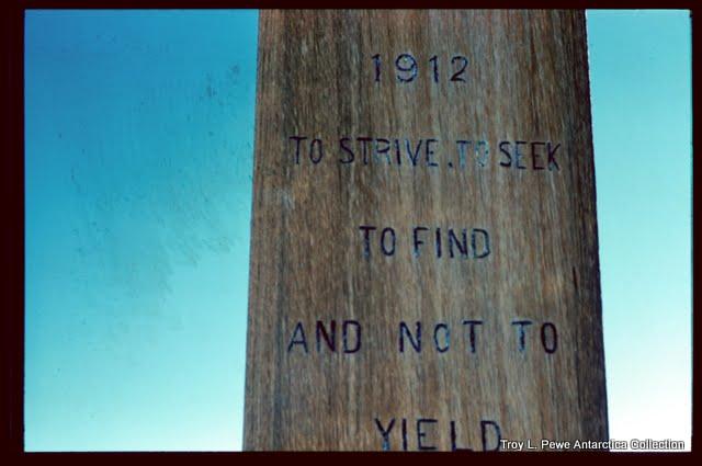 Close-up of the Memorial Cross to Scott on top of Observation Hill which shows the following - 1912 To strive to seek to find and not to yield.
