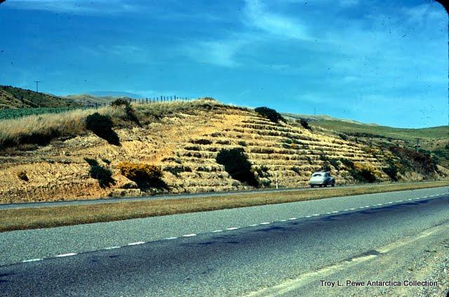 Excellent view of the terraced loess hills. A means of keeping the loess from slumping by step terracing along the paved highway called the north road just north of Wellington near Porirua.