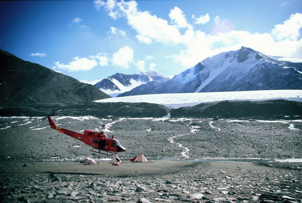 Helicopter landing at camp site
