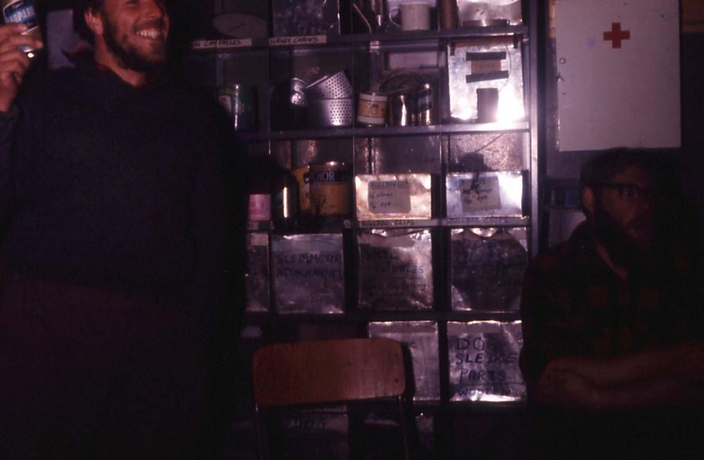 Person standing with sled dogs