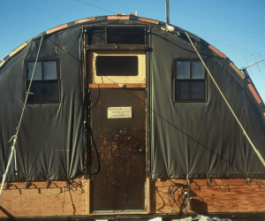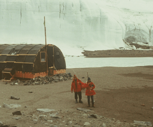 Two people outside old Jameway hut and equipment near Lake Hoare