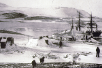Historical Photograph: Ship at Hut Point with crew and dogs near Discovery Hut |